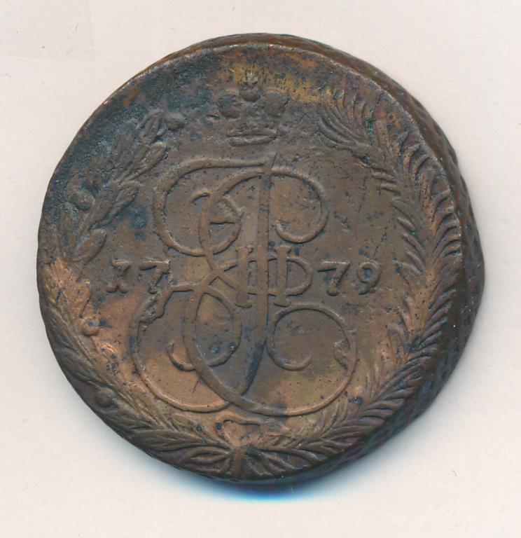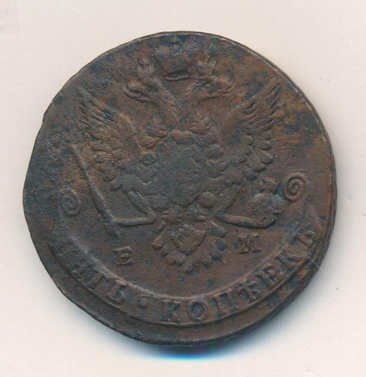 Лицевая сторона — двуглавый орел (выделяют 17 типов орла) и обозначение номинала (пять копеекъ), оборотная — вензель Екатерины II и дата. Нормативный вес — 51,19 грамма, гурт — сетка или шнур.