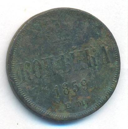 Лицевая сторона — вензель Николая I, оборотная — обозначение номинала (копейка) и дата. Нормативный вес — 5,12 грамма, гурт гладкий.