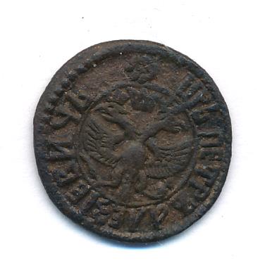 На лицевой стороне — гербовый орел и надпись «царь петр алексеевич», на оборотной - «всея россии самодержец» и обозначение номинала (полушка).