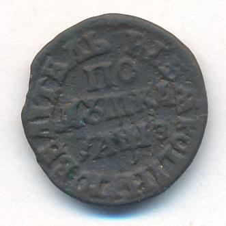 На лицевой стороне — гербовый орел и надпись «царь петр алексеевич», на оборотной - «всея россии самодержец» и обозначение номинала (полушка).