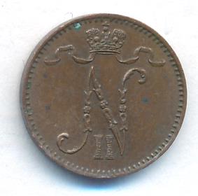 Лицевая сторона — вензель Александра II, оборотная — номинал (1 PENNIA) и дата. Нормативный вес — 1,28 грамма, гурт гладкий.