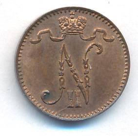 Лицевая сторона — вензель Александра II, оборотная — номинал (1 PENNIA) и дата. Нормативный вес — 1,28 грамма, гурт гладкий.