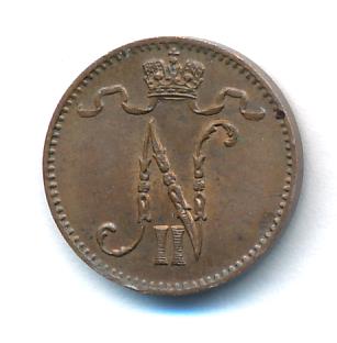 Лицевая сторона — вензель Александра II, оборотная — номинал (1 PENNIA) и дата. Нормативный вес — 1,28 грамма, гурт гладкий.