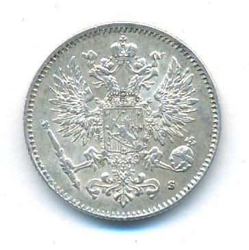 Лицевая сторона — российский двуглавый орел с гербом Великого княжества Финляндского на груди, оборотная — номинал и дата в венке из дубовых листьев. Проба — 750, нормативный вес — 2,55 грамма, гурт рубчатый.