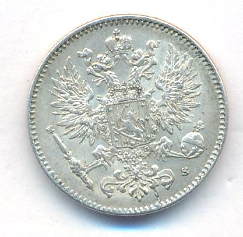 Лицевая сторона — российский двуглавый орел с гербом Великого княжества Финляндского на груди, оборотная — номинал и дата в венке из дубовых листьев. Проба — 750, нормативный вес — 2,55 грамма, гурт рубчатый.