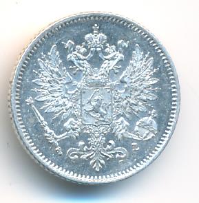 Лицевая сторона — российский двуглавый орел с гербом Великого княжества Финляндского на груди, оборотная — номинал и дата в венке из дубовых листьев. Проба — 750, нормативный вес — 1,27 грамма, гурт рубчатый.