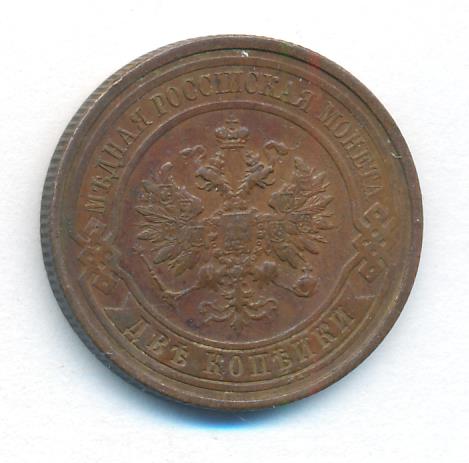 Лицевая сторона — двуглавый орел, надпись МЕДНАЯ РОССIЙСКАЯ МОНЕТА и обозначение номинала (две копейки); оборотная — обозначение номинала (2 копейки) в бусовом ободке и дата. Нормативный вес — 6,55 грамма, гурт рубчатый.
