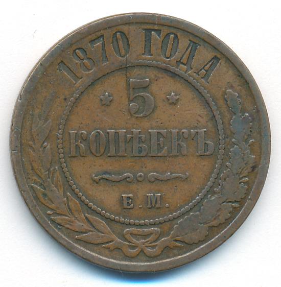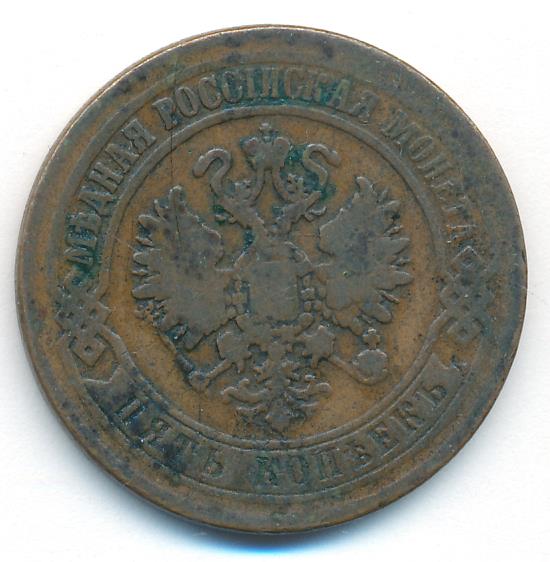 Лицевая сторона — двуглавый орел, надпись МЕДНАЯ РОССIЙСКАЯ МОНЕТА и обозначение номинала (пять копеекъ); оборотная — обозначение номинала (5 копеекъ) в бусовом ободке и дата. Нормативный вес — 16,38 грамма, гурт рубчатый.