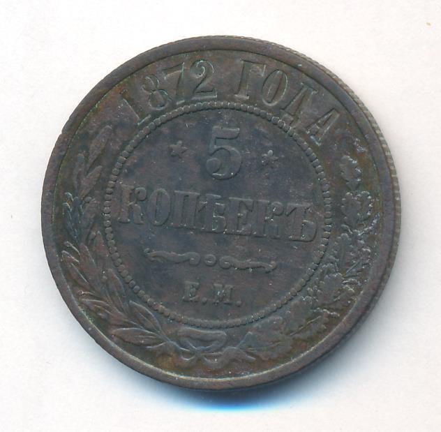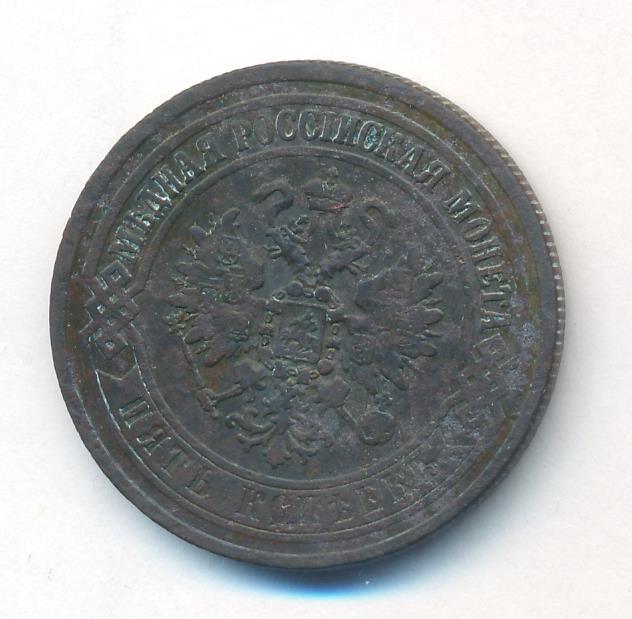 Лицевая сторона — двуглавый орел, надпись МЕДНАЯ РОССIЙСКАЯ МОНЕТА и обозначение номинала (пять копеекъ); оборотная — обозначение номинала (5 копеекъ) в бусовом ободке и дата. Нормативный вес — 16,38 грамма, гурт рубчатый.