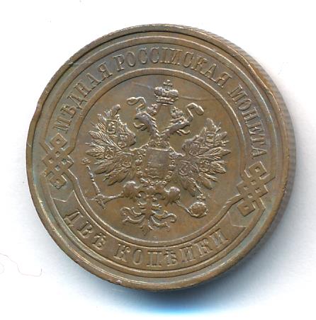 Лицевая сторона — двуглавый орел, надпись МЕДНАЯ РОССIЙСКАЯ МОНЕТА и обозначение номинала (две копейки); оборотная — обозначение номинала (2 копейки) в бусовом ободке и дата. Нормативный вес — 6,55 грамма, гурт рубчатый.