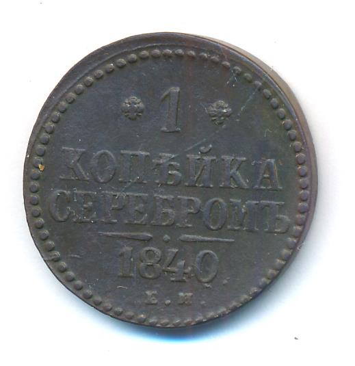 На новых монетах равенство серебряному курсу указано прямо в номинале: «1 КОПЕЙКА СЕРЕБРОМ». Указ об их выпуске следует 6 сентября 1840 года («О новой медной монете на серебро 16-рублевого в пуде достоинства»). Массовая чеканка началось за год до этого на Екатеринбургском (знак ЕМ) и Сузунском (знак СМ) дворах. В качестве временной меры в 1840-1843 годах к ним подключается Ижорский завод (знак СПМ). С 1844 года после «значительного скопления медной монеты в народном обращении» в Екатеринбурге производство прекращается, а в Сузуне сокращается.