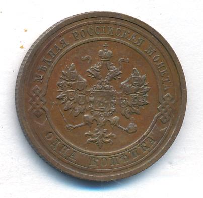 Лицевая сторона — двуглавый орел, надпись МЕДНАЯ РОССIЙСКАЯ МОНЕТА и обозначение номинала (одна копейка); оборотная — обозначение номинала (1 копейка) в бусовом ободке и дата. Нормативный вес — 3,28 грамма, гурт рубчатый.