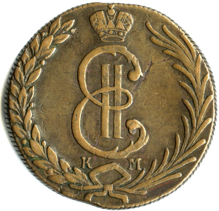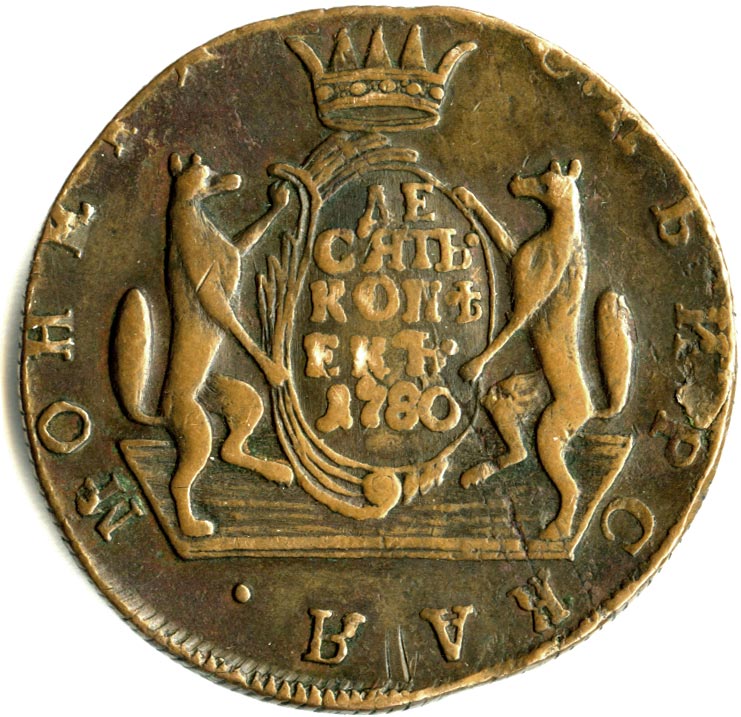 Лицевая сторона - два соболя поддерживают щит с обозначением номинала (десять копеекъ) под короной, надпись «СИБИРСКАЯ МОНЕТА». Оборотная — вензель Екатерины II в венке из пальмовой и лавровой ветвей. Вес — 65, 52 грамма. Нормативный вес — 65,52 грамма, это самая увесистая медная монета регулярного чекана в истории российской нумизматики. Гурт — надпись «колыванская медь» или шнур.