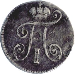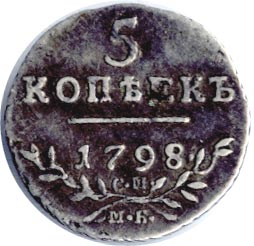Лицевая сторона - вензель Павла I под короной, оборотная - обозначение номинала (5 копеекъ) и дата. Проба — 868, нормативный вес — 1,46 грамма, гурт — шнур.