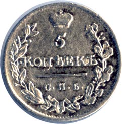 Лицевая сторона - двуглавый орел и дата, оборотная — обозначение номинала (5 копеекъ) в венке из лавровой и дубовой ветвей. Проба до 1813 года — 750, нормативный вес — 1,2 грамма; после 1813 года — проба 868, нормативный вес — 1,04 грамма.