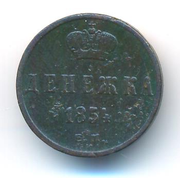 Лицевая сторона — вензель Николая I, оборотная — обозначение номинала (денежка) и дата. Нормативный вес — 2,56 грамма, гурт гладкий.