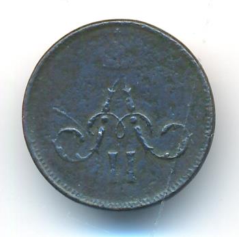 Лицевая сторона — вензель Николая I, оборотная — обозначение номинала (денежка) и дата. Нормативный вес — 2,56 грамма, гурт гладкий.