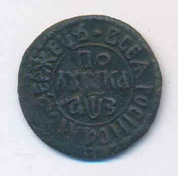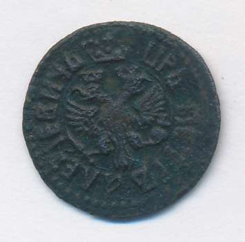 На лицевой стороне — гербовый орел и надпись «царь петр алексеевич», на оборотной - «всея россии самодержец» и обозначение номинала (полушка).