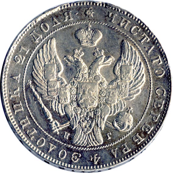 В январе 1830 года Николай I дает министру финансов Е. Ф. Канкрину устное указание «о сделании на золотых и серебряных монетах орла как на платиновых». На новом гербе крылья орла подняты, на них размещены шесть местных гербов — казанский, астраханский, сибирский, польский, херсонесский и финляндский. На груди орла — московский герб, на головах — короны. С 1832 года заодно с орлом изменяются и композиции обеих сторон монет: на лицевой стороне содержание чистого серебра в монете теперь обозначает круговая надпись, слово МОНЕТА на оборотной подчеркивает нарицательную стоимость, отличая полновесное денежное средство от рубля ассигнациями (нужно помнить, что доставшаяся Николаю в наследство от трех прежних правлений масса обесцененных бумажных денег является острой экономической проблемой. Правительство Николая удерживает объем ассигнаций строго на одном уровне, не прибегая к дополнительным эмиссиям; курс рубля ассигнациями колеблется вокруг 35 копеек).