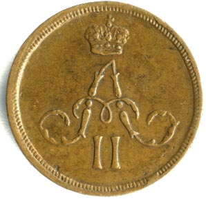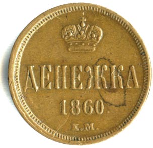 Лицевая сторона — вензель Николая I, оборотная — обозначение номинала (денежка) и дата. Нормативный вес — 2,56 грамма, гурт гладкий.