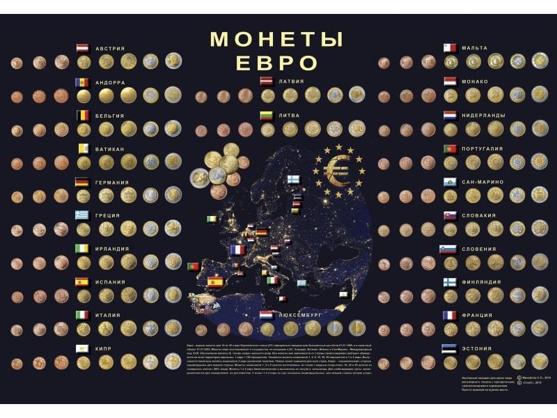 Особенности: Размер: 700х1000х1 мм. Материал: двухстороннюю ламинированный картон. Снабжён профилем с двумя ушками для размещения на стене и комплектом из 236 прозрачных самоклеющихся кармашков для монет в листах: на 48 монет - 2 шт., 35 монет - 4 шт. На планшете с ночным космическим снимком Европы размещены изображения аверсов монет регулярного чекана всех номиналов всех стран, входящих в зону евро. Прозрачный кармашек с монетой приклеивается на нужное место. Кроме того, на верхнем и нижнем поле планшета можно разместить кармашки с памятными монетами номиналом 2 евро.