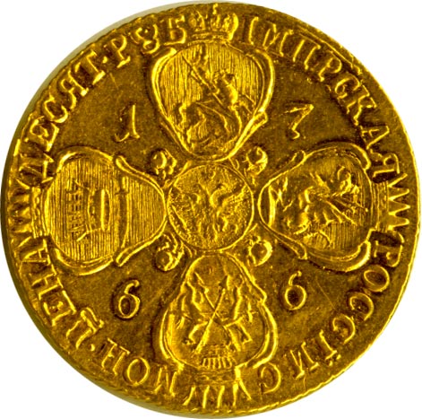 Лицевая сторона — портрет императрицы и надпись «Б М ЕКАТЕРИНА II IМП И САМОД ВСЕРОС», оборотная — крестообразная композиция из гербов и дата; надпись «IМПЕРСКАЯ РОССIИС МОН ЦЕНА ДЕСЯТЬ РУБ».