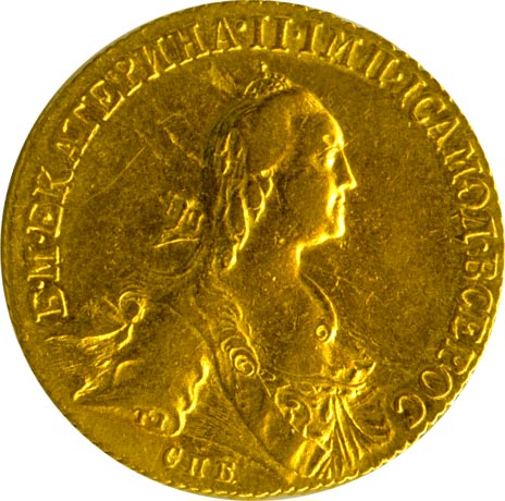 В правление Екатерины II золотые монеты сохраняют свой ставший уже привычным вид, а их количество многократно возрастает. Постепенно золото занимает устойчивое место в денежном обращении.