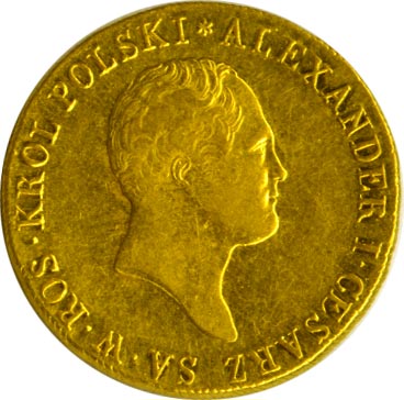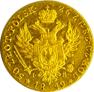На гербовой стороне золотых, серебряных и медных монет 1816-1835 годов на груди российского орла помещен герб Польского королевства под королевской короной и пологом. В надписи на оборотной стороне золотых монет, кроме номинала, указано их количество в штуках (26) в золотой кёльнской марке.
