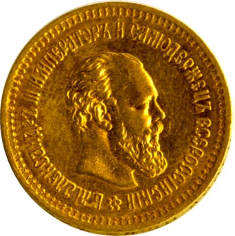 Лицевая сторона — портрет Александра III и надпись «Б.М.АЛЕКСАНДРЪ III ИМПЕРАТОРЪ И САМОДЕРЖЕЦЪ ВСЕРОССIЙСКIЙ»», оборотная — двуглавый орел, обозначение номинала (5 рублей) и дата.