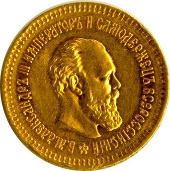 Лицевая сторона — портрет Александра III и надпись «Б.М.АЛЕКСАНДРЪ III ИМПЕРАТОРЪ И САМОДЕРЖЕЦЪ ВСЕРОССIЙСКIЙ»», оборотная — двуглавый орел, обозначение номинала (5 рублей) и дата.