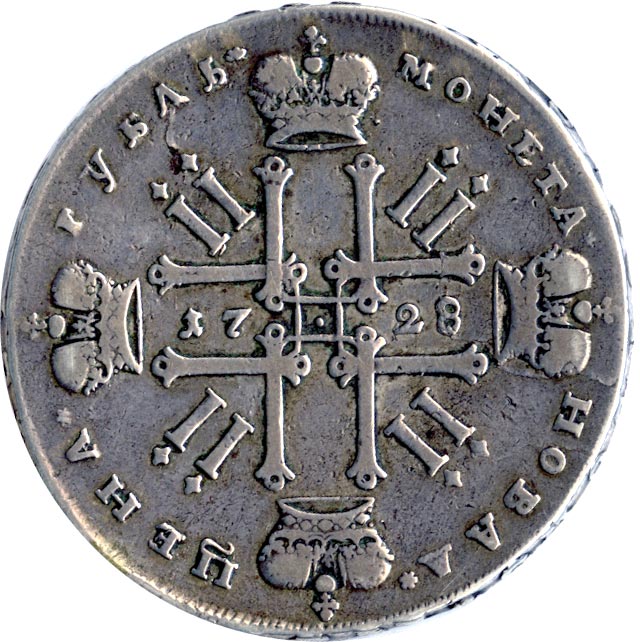 На рублях Петра II двуглавый орел на оборотной стороне заменяется монограммой из четырех П и четырех ii по образцу рублей Петра I.