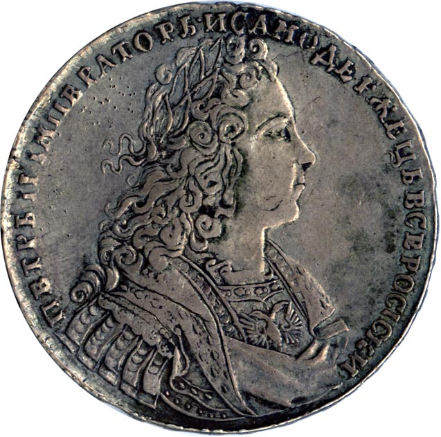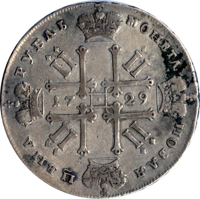 Рубль 1728-1729 годов «Голова внутри надписи»