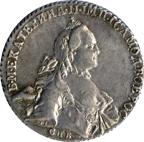 Лицевая сторона — портрет императрицы и надпись «Б М ЕКАТЕРИНА II IМП I САМОД ВСЕРОС», оборотная — двуглавый орел и надпись «МОНЕТА РУБЛЬ» и дата. Проба — 750, нормативный вес — 24 грамма, гурт — шнур.