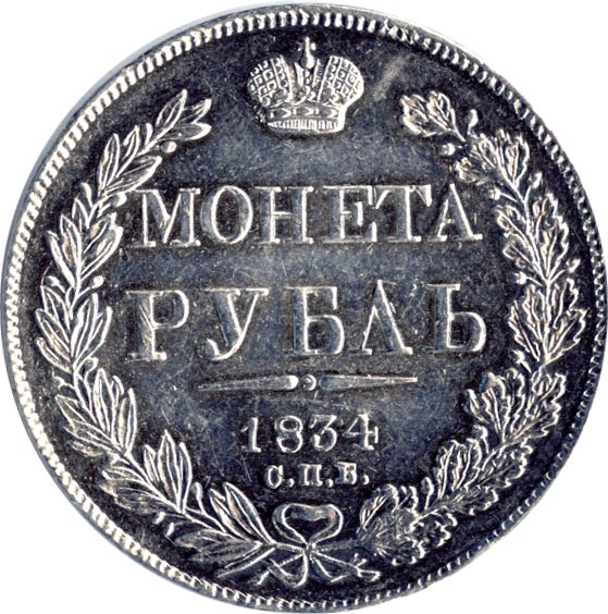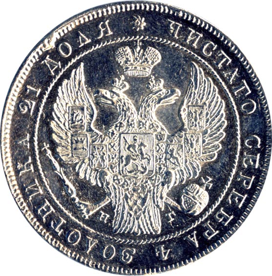 В январе 1830 года Николай I дает министру финансов Е. Ф. Канкрину устное указание «о сделании на золотых и серебряных монетах орла как на платиновых». На новом гербе крылья орла подняты, на них размещены шесть местных гербов — казанский, астраханский, сибирский, польский, херсонесский и финляндский. На груди орла — московский герб, на головах — короны. С 1832 года заодно с орлом изменяются и композиции обеих сторон монет: на лицевой стороне содержание чистого серебра в монете теперь обозначает круговая надпись, слово МОНЕТА на оборотной подчеркивает нарицательную стоимость, отличая полновесное денежное средство от рубля ассигнациями (нужно помнить, что доставшаяся Николаю в наследство от трех прежних правлений масса обесцененных бумажных денег является острой экономической проблемой. Правительство Николая удерживает объем ассигнаций строго на одном уровне, не прибегая к дополнительным эмиссиям; курс рубля ассигнациями колеблется вокруг 35 копеек).