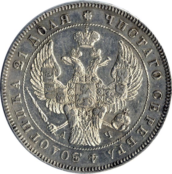 В январе 1830 года Николай I дает министру финансов Е. Ф. Канкрину устное указание «о сделании на золотых и серебряных монетах орла как на платиновых». На новом гербе крылья орла подняты, на них размещены шесть местных гербов — казанский, астраханский, сибирский, польский, херсонесский и финляндский. На груди орла — московский герб, на головах — короны. С 1832 года заодно с орлом изменяются и композиции обеих сторон монет: на лицевой стороне содержание чистого серебра в монете теперь обозначает круговая надпись, слово МОНЕТА на оборотной подчеркивает нарицательную стоимость, отличая полновесное денежное средство от рубля ассигнациями (нужно помнить, что доставшаяся Николаю в наследство от трех прежних правлений масса обесцененных бумажных денег является острой экономической проблемой. Правительство Николая удерживает объем ассигнаций строго на одном уровне, не прибегая к дополнительным эмиссиям; курс рубля ассигнациями колеблется вокруг 35 копеек).