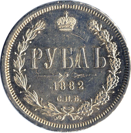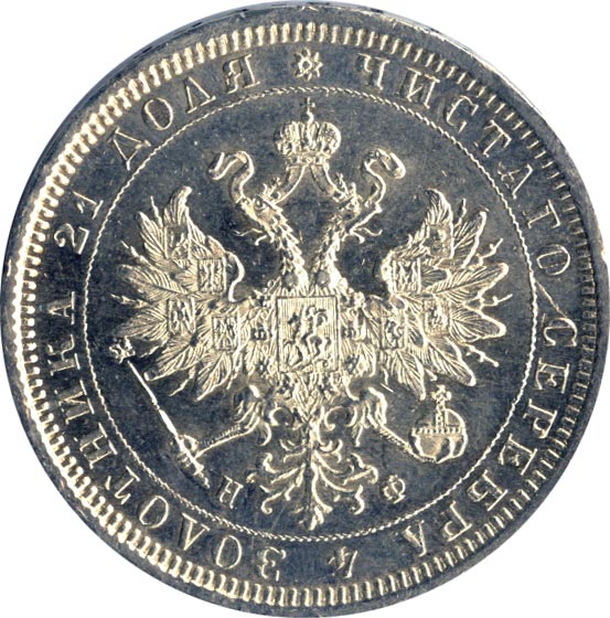 Лицевая сторона — гербовый орел и надпись «ЧИСТОГО СЕРЕБРА 4 ЗОЛОТНИКА 21 ДОЛЯ», оборотная — обозначение номинала «РУБЛЬ», окруженное венком из лавровой и дубовой ветвей и дата.
