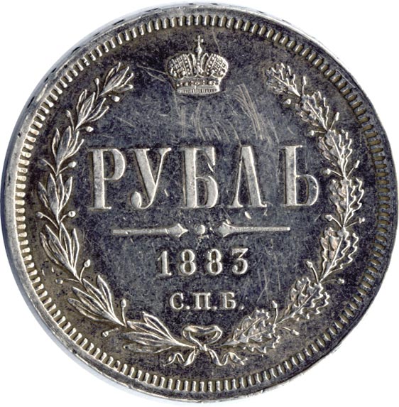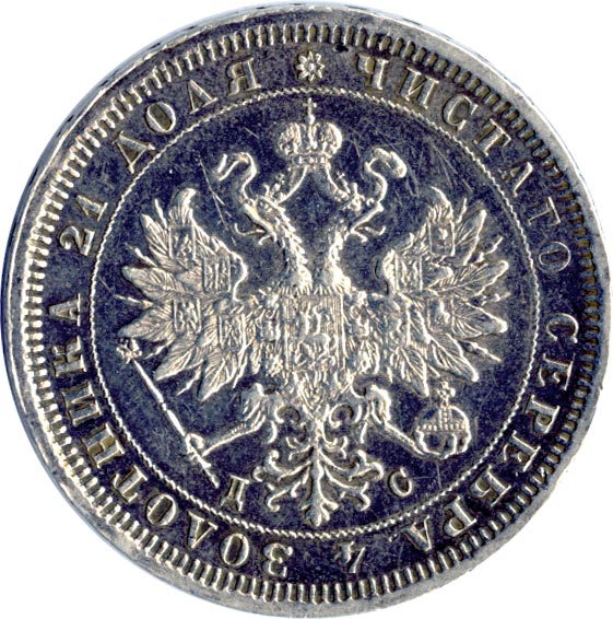 Лицевая сторона — гербовый орел и надпись «ЧИСТОГО СЕРЕБРА 4 ЗОЛОТНИКА 21 ДОЛЯ», оборотная — обозначение номинала «РУБЛЬ», окруженное венком из лавровой и дубовой ветвей и дата.
