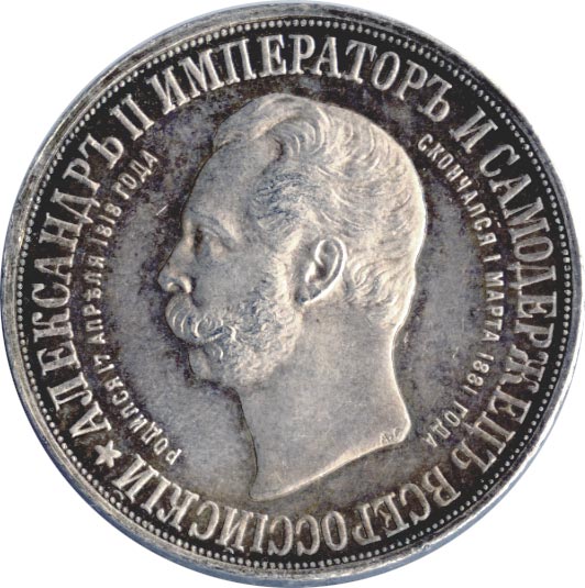 Памятник Александру II был заложен при его сыне, Александре III в 1893 году неподалеку от Кремля, а открыт и освящен при внуке — Николае II в 1898 году. В 1918 году мемориал был разрушен. Памятные монеты выпущены тиражом 5 000 штук. Автор портрета, по всей видимости, Грилихес-сын (знак АГ расположен в обрезе шеи).