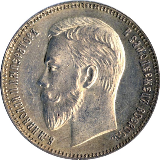 Николай II сохраняет принятый отцом тип, но на банковских монетах его портрет (работы Васютинского) повернут влево (на запад). На оборотной стороне сохраняется тот же герб, вплоть до знака АГ под задней ногой коня.