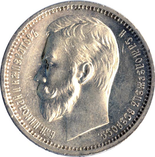 Николай II сохраняет принятый отцом тип, но на банковских монетах его портрет (работы Васютинского) повернут влево (на запад). На оборотной стороне сохраняется тот же герб, вплоть до знака АГ под задней ногой коня.