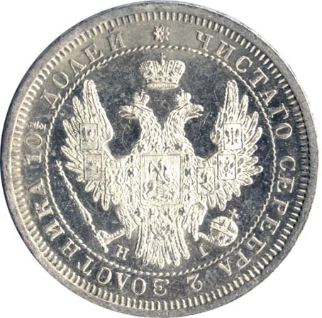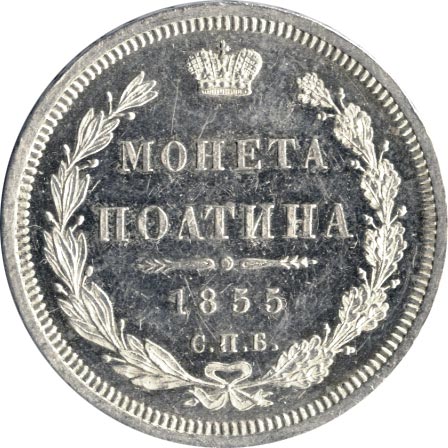 Лицевая сторона — новый гербовый орел с поднятыми крыльями и надпись «ЧИСТОГО СЕРЕБРА 2 ЗОЛОТНИКА 10 ДОЛЕЙ», оборотная — надпись «МОНЕТА ПОЛТИНА», окруженная венком из лавровой и дубовой ветвей и дата.