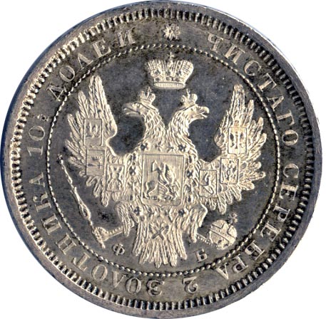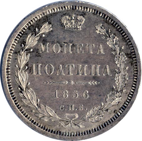 Лицевая сторона — новый гербовый орел с поднятыми крыльями и надпись «ЧИСТОГО СЕРЕБРА 2 ЗОЛОТНИКА 10 ДОЛЕЙ», оборотная — надпись «МОНЕТА ПОЛТИНА», окруженная венком из лавровой и дубовой ветвей и дата.