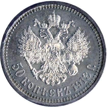 Лицевая сторона — портрет Николая II в круговой надписи «Б.М. НИКОЛАЙ II ИМПЕРАТОРЪ И САМОДЕРЖЕЦЪ ВСЕРОСС», оборотная — двуглавый орел, обозначение номинала (50 копеекъ) и дата.