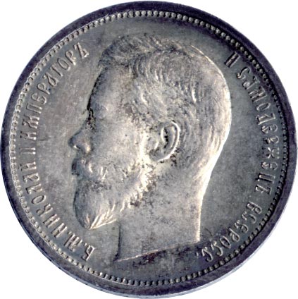 Николай II сохраняет принятый отцом тип, но на банковских монетах его портрет (работы Васютинского) повернут влево (на запад). На оборотной стороне сохраняется тот же герб, вплоть до знака АГ под задней ногой коня.