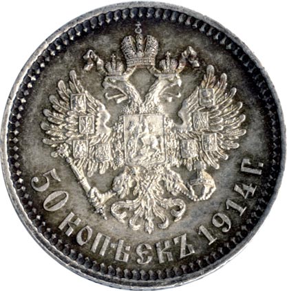 Лицевая сторона — портрет Николая II в круговой надписи «Б.М. НИКОЛАЙ II ИМПЕРАТОРЪ И САМОДЕРЖЕЦЪ ВСЕРОСС», оборотная — двуглавый орел, обозначение номинала (50 копеекъ) и дата.