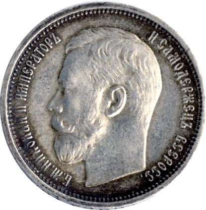 Николай II сохраняет принятый отцом тип, но на банковских монетах его портрет (работы Васютинского) повернут влево (на запад). На оборотной стороне сохраняется тот же герб, вплоть до знака АГ под задней ногой коня.