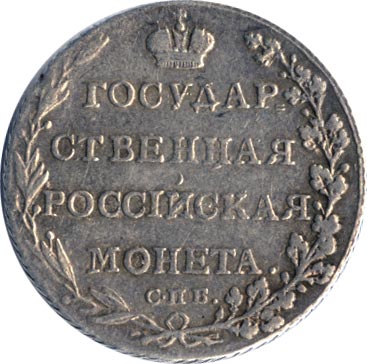 В первые годы правления Александра I серебряные монеты печатаются по прежней норме на Банковском дворе. После многочисленных проб нового оформления (в том числе с портретом в стиле римских императоров) указом от 31 августа 1801 года на их лицевую сторону помещается гербовый орел в кольце, а на оборотную — окруженная венком из лавровой и дубовой ветвей надпись «ГОСУДАРСТВЕННАЯ РОССIЙСКАЯ МОНЕТА».