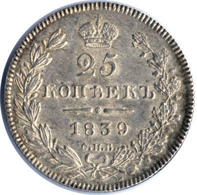 Лицевая сторона — новый гербовый орел с поднятыми крыльями и надпись «ЧИСТОГО СЕРЕБРА 1 ЗОЛОТНИКЪ 5 ДОЛЕЙ», оборотная —обозначение номинала (25 копеекъ), окруженное венком из лавровой и дубовой ветвей и дата.