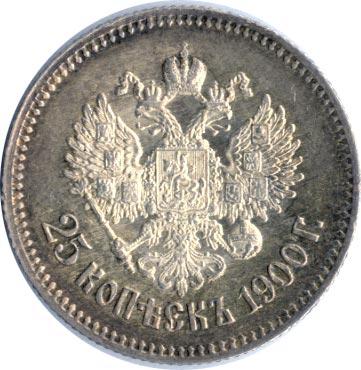 Лицевая сторона — портрет Николая II в круговой надписи «Б.М. НИКОЛАЙ II ИМПЕРАТОРЪ И САМОДЕРЖЕЦЪ ВСЕРОСС», оборотная — двуглавый орел, обозначение номинала (25 копеекъ) и дата.