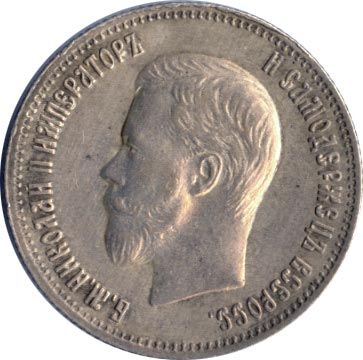 Николай II сохраняет принятый отцом тип, но на банковских монетах его портрет (работы Васютинского) повернут влево (на запад). На оборотной стороне сохраняется тот же герб, вплоть до знака АГ под задней ногой коня.